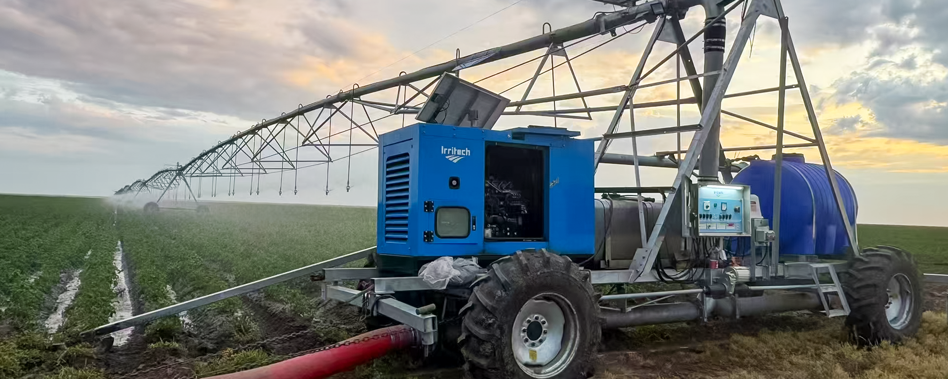 The large four-wheel linear move irrigation system is a high-capacity, self-propelled machine with an irrigation coverage rate of over 98%. It is suitable for irrigating corn, wheat, alfalfa, potatoes, grains, vegetables, sugar crops, and other high-value crops. The machine can also apply fertilizers, pesticides, and herbicides, offering practical, advanced, energy-efficient, water-saving, and highly automated performance.
